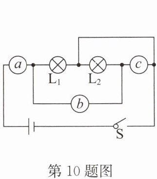 10. 如图所示,闭合开关S后,$L_{1}和L_{2}$两个灯泡并联,a、b、c三个电表(可能是电流表或电压表)的示数依次为1.5、1.0、2.0(单位为V或A),则灯泡$L_{1}$两端的电压为