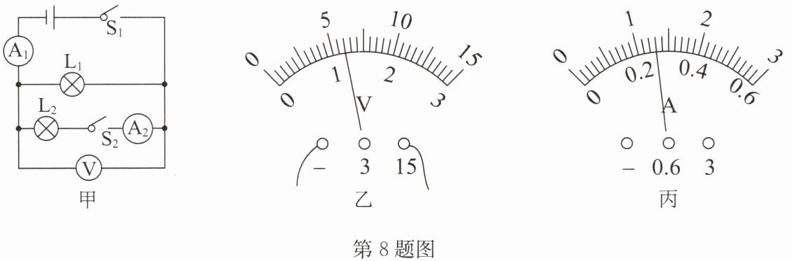 8. 如图甲所示,仅闭合开关$S_{1}$,电压表的示数如图乙所示;再闭合开关$S_{2}$,两只电流表的指针位置均如图丙所示.