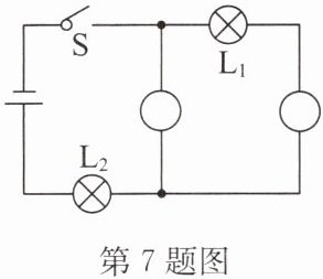 7. 如图所示,闭合开关S后,灯泡$L_{1}$、$L_{2}$都发光,请在圆圈内填上电流表或电压表的符号并标出两电表的“+”“-”接线柱.