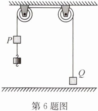 6. 如图所示,质量为2m的物块P下方连接有一个质量为m的钩码,上端通过细线绕过轻质定滑轮连接一质量为2m的物块Q,将它们由静止释放.在物块P下落到地面的过程中,P、Q间细线拉力大小为F(细线重力及各处的摩擦均不计,钩码落地后不弹起).下列说法正确的是(
