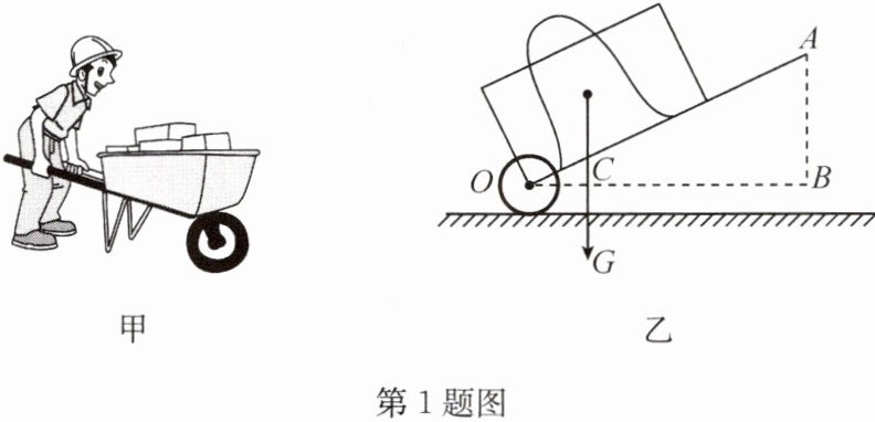 1. 如图甲所示的独轮车是生活中搬运砖块的轻便工具. 某次搬运砖块时, 车体和砖块的总重力$G = 1000N$. 图乙为独轮车被抬起到某位置静止时的示意图, 运砖块时从$A$点提起独轮车把手. 已知$AO = 1.2m$,$C为OB$连线上一点,$OC = 0.3m$,$OB = 1.0m$.