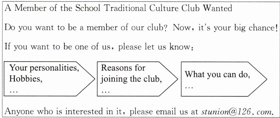 假如你是 Lucy,想加入学校传统文化俱乐部。请根据招聘要求写一封自荐信,阐述你的理由。