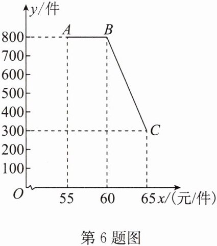 6.(2024·惠山区期中)某商店销售一种服装,经市场调研发现,该服装销量y(件)与售价x(元/件)之间存在如图像中折线A-B-C所示的函数关系.已知该服装进货价为42元/件,x的取值范围为$55\leqslant x\leqslant 65$.