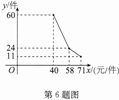 ∴当40 ≤ x ≤ 58时,y与x之间的函数表达式为y=−2x+140;同理可得,当58 < x ≤ 71时,y与x之间的函数表达式为y=−x+82.综上,y与x之间的函数表达式为$y = \begin{cases}-2x + 140(40 ≤ x ≤ 58)\\-x + 82(58 < x ≤ 71)\end{cases}$。