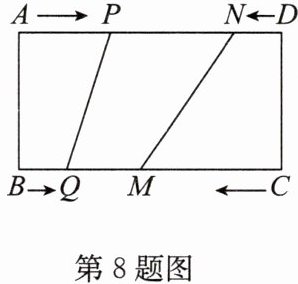 8. (2024·清江浦区期中)如图,在矩形ABCD中,BC= 20 cm,点P,Q,M,N分别同时从点A,B,C,D出发,沿AD,BC,CB,DA方向在矩形的边上运动,当有一个点先到达所在边的另一个端点时,运动即停止. 已知在相同时间内,若BQ= x cm(x≠0),则$AP= 2x cm,CM= 3x cm,DN= x^2 cm.$