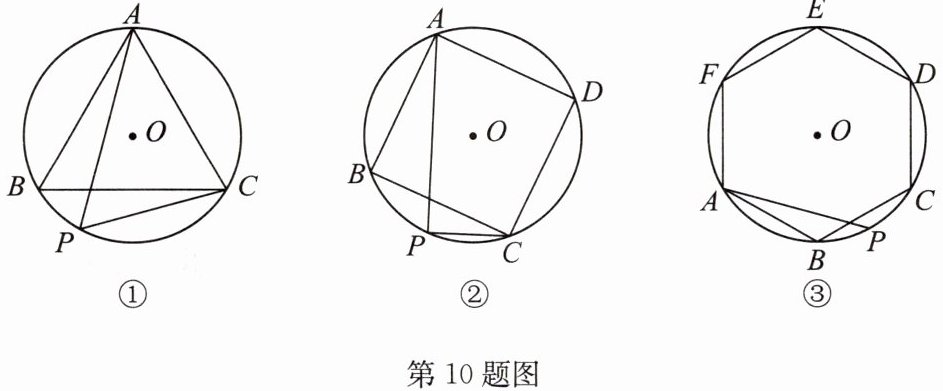 10. (2024·崇川区月考)(1)如图①,$\triangle ABC是\odot O$的内接正三角形,P为劣弧BC上一动点,求证:$PA= PB+PC;$