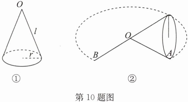 10. 如图①,圆锥的母线长$l= 16$ cm,若以顶点O为中心,将此圆锥按图②放置在平面上逆时针滚动3圈后所形成的扇形的圆心角$\theta=270^{\circ}$.求: