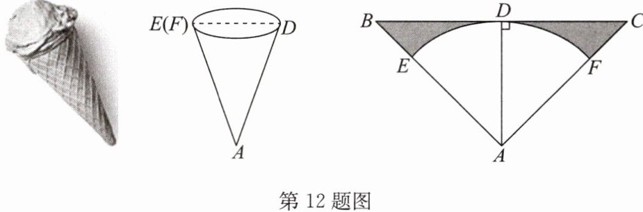 12. 某种冰激凌的外包装可以视为圆锥,它的底面圆直径ED与母线AD的长度之比为$1:2$.制作这种外包装需要用如图所示的等腰三角形材料,其中$AB= AC,AD⊥BC$.将扇形AEF围成圆锥时,AE,AF恰好重合.