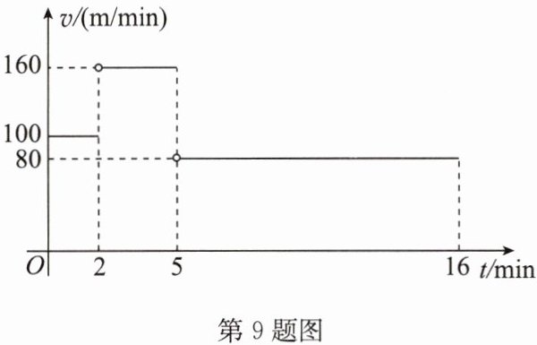 9. 小明从家出发,沿一条直道跑步,经过一段时间后按原路返回,刚好在第$16 min$回到家中,设小明出发第$t min时的速度为v m/min$,离家的距离为$s m$,$v与t$之间的函数关系如图所示(图中的空心圈表示不包含这一点).