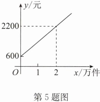 5. (2024·清江浦区期末)某公司市场营销部的营销员有部分收入按照业务量或销售额提成,即多卖多得.营销员的月提成收入 $ y $(元)与其每月的销售量 $ x $(万件)成一次函数关系,其图象如图所示.根据图象提供的信息,解答下列问题: