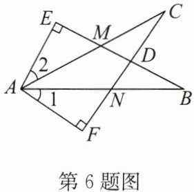 6. (2024·涟水县期末)如图,$EB交AC于点M$,交$FC于点D$,$AB交FC于点N$,$\angle E= \angle F= 90^{\circ}$,$\angle B= \angle C$,$AE= AF$,给出下列结论:①$\angle 1= \angle 2$;②$CM= AM$;③$\triangle ACN\cong\triangle ABM$;④$BE= CF$.其中正确的结论有(