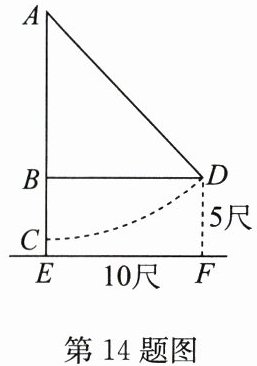 14. 我国明代一位杰出的数学家提出一道“荡秋千”的数学问题:“平地秋千未起,踏板一尺离地,送行二步与人齐,五尺人高曾记;仕女佳人争蹴,终朝笑语欢嬉,良工高士素好奇,算出索长有几?”其意思为:如图所示,当秋千静止在地面上时,秋千的踏板离地的距离为一尺$(CE = 1尺)$,将秋千的踏板往前推两步(每一步合五尺,即$EF = 10$尺),秋千的踏板与人一样高,这个人的身高为五尺$(DF = 5尺)$,则秋千的绳索$AC$的长度是______尺。