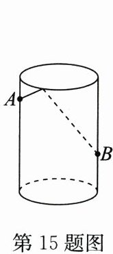 15. 如图,圆柱形玻璃杯高为14cm,底面周长为32cm,在杯内壁离杯底5cm的点$B$处有一滴蜂蜜,此时一只蚂蚁正好在杯外壁,离杯上沿3cm与蜂蜜相对的$A$处,则蚂蚁从外壁$A处到内壁B$处的最短距离为______cm。(杯壁厚度不计)
