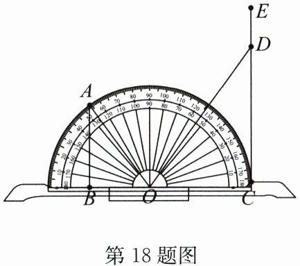 18.(8分)(2024·连云港期末)小丽在物理实验课上利用如图所示的“光的反射演示器”直观呈现了光的反射原理。她用激光笔从量角器左边边缘点$A$处发出光线,经量角器圆心$O$处(此处放置平面镜)反射后,反射光线落在右边光屏$CE上的点D$处(点$C$也在量角器的边缘上,$O$为量角器的中心,$C$,$O$,$B$三点共线,$AB\perp BC$,$CE\perp BC$)。小丽在实验中还记录下了$AB = 6cm$,$BC = 12cm$。依据记录的数据,求量角器的半径$OC$的长。