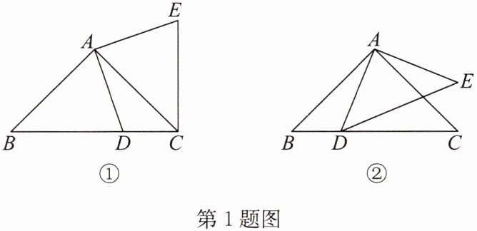 1. (1)如图①,在$Rt△ABC$中,$∠BAC= 90^{\circ },AB= AC$,D 为 BC 边上一点(不与点 B,C 重合),将线段 AD 绕点 A 逆时针旋转$90^{\circ }$得到线段 AE,连接 EC. 求证:$△ABD\cong △ACE;$