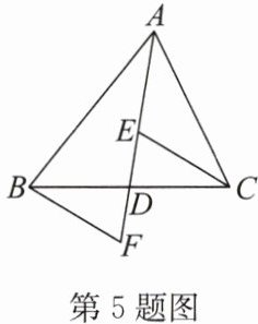 5.如图,AD是$\triangle ABC$的中线,E,F分别是AD和AD延长线上的点,且$DE= DF$,连接BF,CE,下列结论:①$\triangle ABD和\triangle ACD$面积相等;②$\triangle BDF\cong \triangle CDE$;③$BF// CE$;④$CE= AE$;⑤$\triangle ABD和\triangle ACD$周长相等.其中正确的有 (