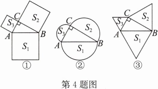4. 如图,分别写出每幅图中三个图形的面积 $ S_{1} $,$ S_{2} $,$ S_{3} $ 之间的关系。(三幅图中直角三角形外围的图形分别是正方形、半圆、等边三角形)