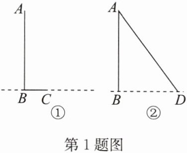 1. 数学兴趣小组要测量旗杆的高度,同学们发现系在旗杆顶端 A 的绳子沿旗杆垂到地面时,测得多出部分 BC 的长为 2 m(如图①),再将绳子拉直(如图②),测得绳子末端的位置 D 到旗杆底部 B 的距离为 6 m,求旗杆 AB 的高.