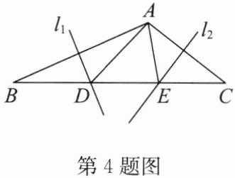 4. (2024·苏州期末改编)如图, 在 $ \triangle ABC $ 中, 边 $ AB $ 的垂直平分线 $ l_1 $ 与边 $ BC $ 相交于点 $ D $, 边 $ AC $ 的垂直平分线 $ l_2 $ 与边 $ BC $ 相交于点 $ E $ (点 $ D $ 在点 $ E $ 的左侧). 若 $ \triangle ADE $ 的周长为 8, 求 $ BC $ 的长.