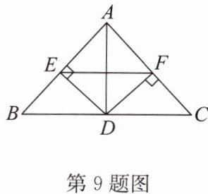 9. (2024·姑苏区期中)如图,在$\triangle ABC$中,$AB= AC$,$D是BC$的中点,$DE\perp AB,DF\perp AC$,垂足分别为$E,F$。求证:$AD垂直平分EF$。