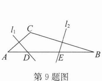 9.(2024·东海县期中)如图,在△ABC中,AC和BC的垂直平分线$l_1和l_2$分别交AB于点D,E.若AD= 3,DE= 4,EB= 5,则△ABC的面积等于______