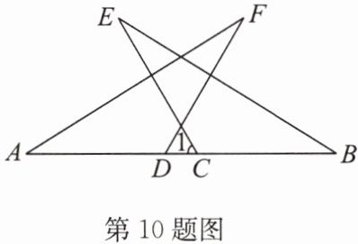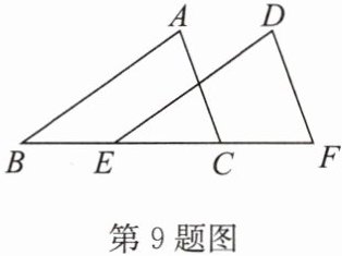 9. 如图,$\triangle ABC\cong \triangle DEF$,且$\angle A= 75^{\circ}$,$\angle B= 35^{\circ}$,$ED= 10\mathrm{cm}$,求$\angle F的度数与AB$的长.