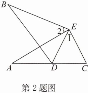2. 如图,$∠A= ∠B$,$AE= BE$,$∠1= ∠2$,点$D在AC$边上.