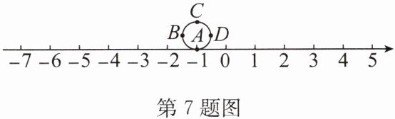 7. 如图,圆的半径为$\frac{2}{\pi}$个单位长度. 数轴上相邻两个数字之间的距离为$1$个单位长度,在圆的四等分点处分别标上点$A$,$B$,$C$,$D$,先让圆周上的点$A与数轴上表示-1$的点重合.