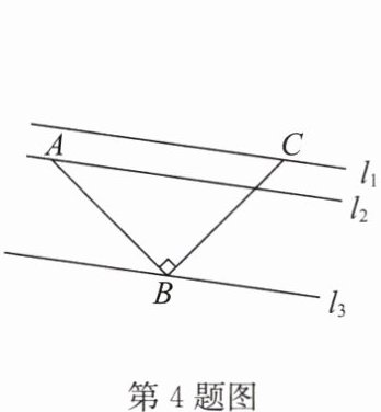 4.(2024·海州区期中)如图,在△ABC中,∠ABC= 90°,AB= BC,三角形的顶点在互相平行的三条直线$l_1$,$l_2$,$l_3$上,且$l_1$,$l_2$之间的距离为1,$l_2$,$l_3$之间的距离为3,则AB的长是 (