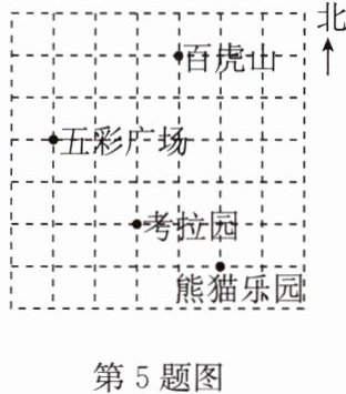 5. 如图是某野生动物世界部分景点的分布示意图,分别以正东、正北方向为x轴,y轴的正方向建立平面直角坐标系,并且“五彩广场”和“考拉园”的坐标分别是(-3,1)和(-1,-1).