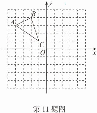 11. (2024·灌云县期末)如图,在平面直角坐标系中,$△ABC三个顶点的坐标分别为A(-4,3),B(-2,4),C(-1,1)$.若$△ABC$向右平移5个单位长度,再向下平移3个单位长度得到$△A'B'C'$,点A,B,C的对应点分别为$A',B',C'$.