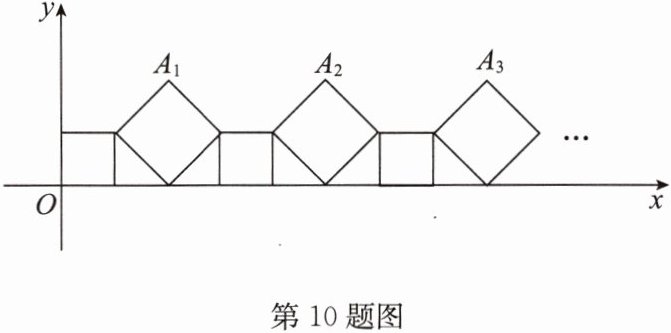 10. 如图,某小区绿化区的护栏是由两种大小不等的正方形间隔排列组成的,将护栏的图案放在平面直角坐标系中.已知小正方形的边长为 1,点$A_{1}的坐标为(2,2)$,点$A_{2}的坐标为(5,2).$