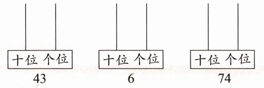 第一个图十位画4个算珠,个位画3个算珠;第二个图个位画6个算珠;第三个图十位画7个算珠,个位画4个算珠。