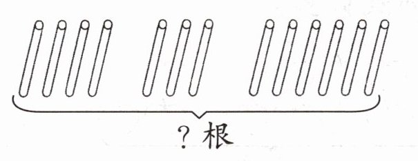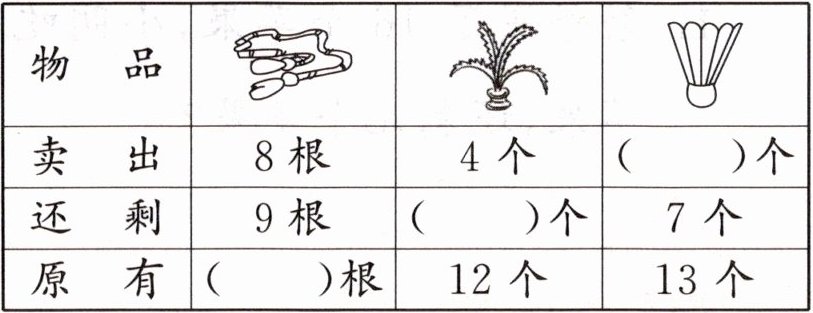 1. $9+3=12$(个) 2. $17-9=8$(个) 3. $14-6=8$(个) 4. $4+3+6=13$(根)