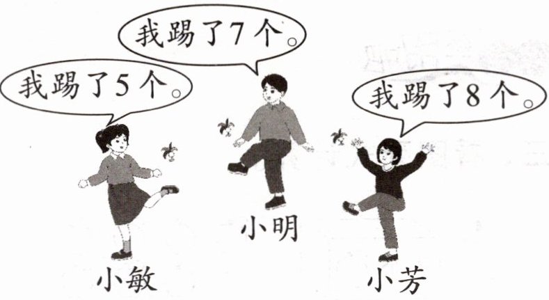 小敏和小明一共踢了多少个?$5 + 7 = 12$(个);小芳比小明多踢了多少个?$8 - 7 = 1$(个)(答案不唯一)。