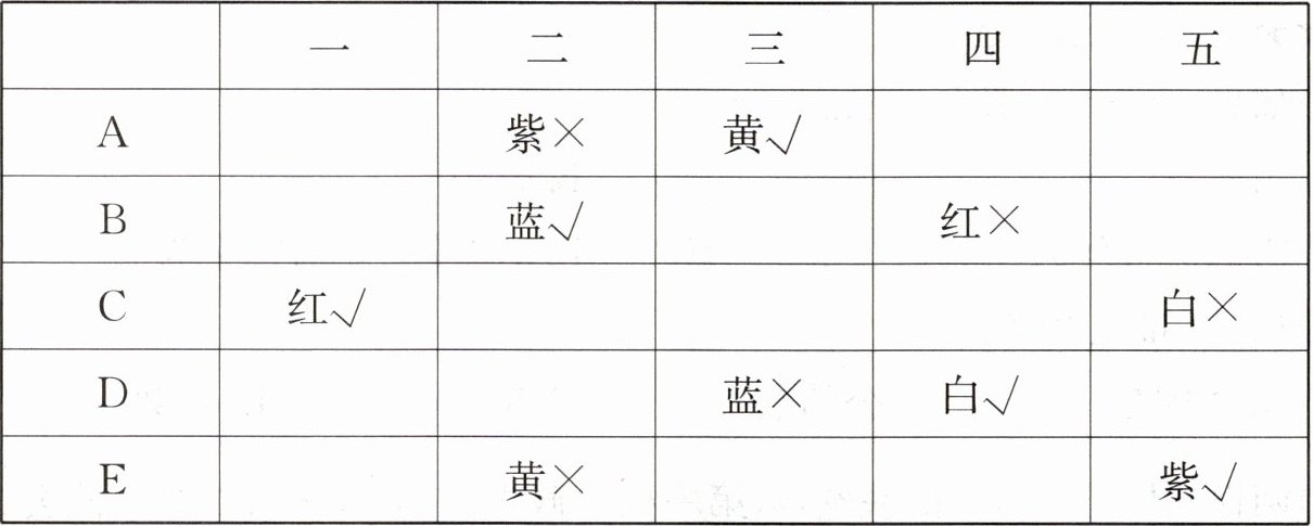 红、黄、蓝、白、紫五种颜色的珠子各一包(从包装袋上看不出里面珠子的颜色),在桌子上排成一行。有A、B、C、D、E五人猜各包珠子的颜色,每人只猜两包。