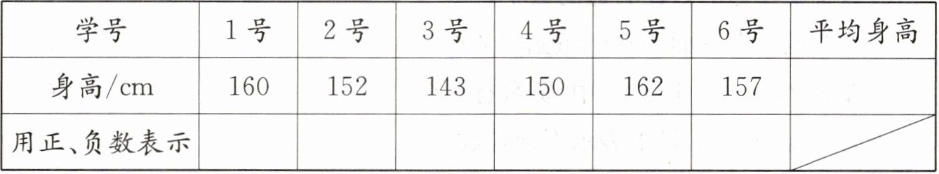 平均身高$154$cm;用正、负数表示依次为$+6$、$-2$、$-11$、$-4$、$+8$、$+3$。