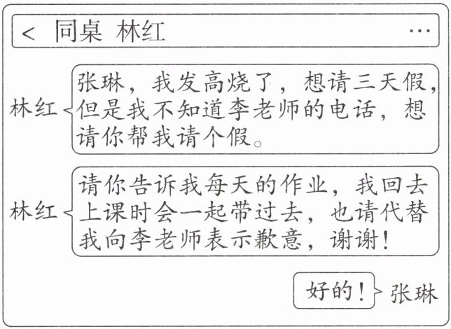 张琳收到了同桌林红发来的消息,请你将消息的内容转述给李老师。