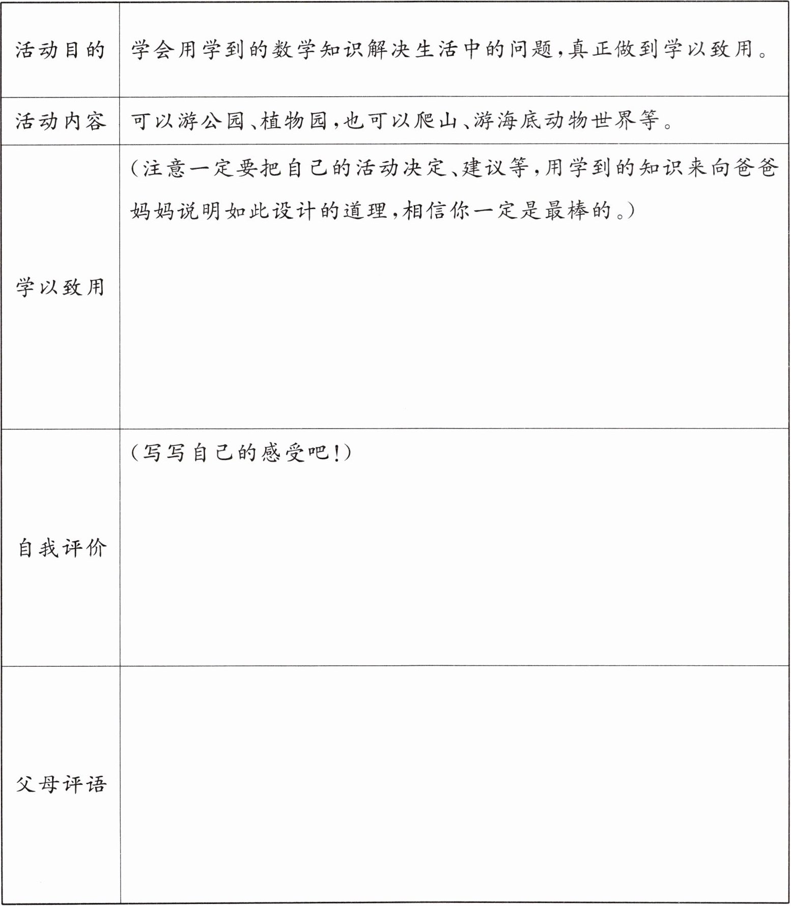 **自我评价**:感受到数学在生活中的实用性,学会用数学思维解决问题,有成就感,以后更自信运用数学知识。