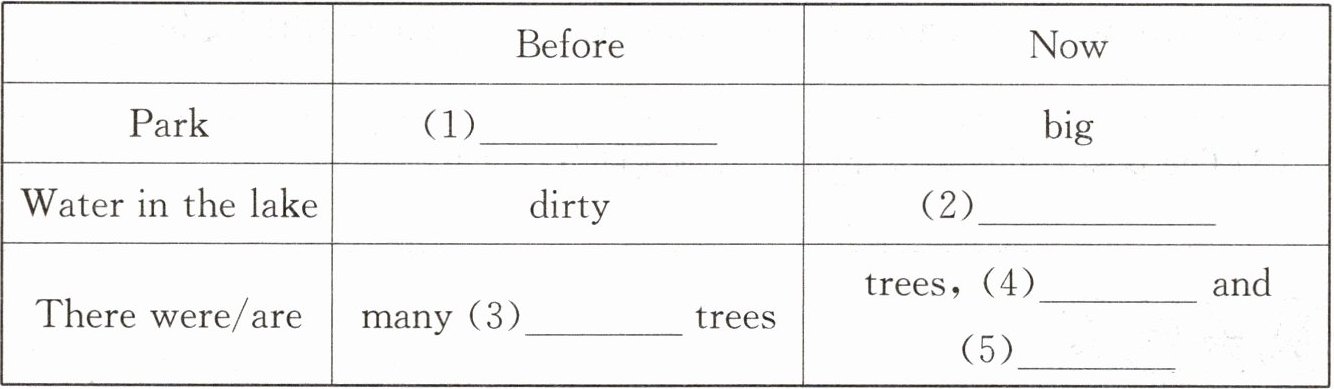 There is a park near my house. Three years ago, it was small. Now, it is very big. There is a lake in the park. Before, the water was dirty. People didn’t like it. Now, the water is clean. Many people like to go boating on the lake. Some people like to fish in the lake. I like to walk in the park. Before, there were many tall trees. Now, there are trees, grass and flowers. They are beautiful. Many children like to play in the park. There are many people doing exercise in the park in the morning. I like the park.