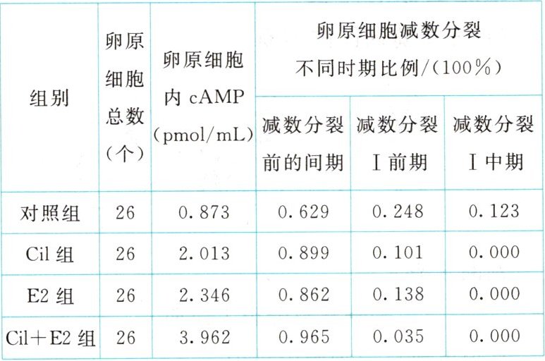 [例 4] (不定项)为探究一定浓度的西洛酰胺(Cil)和$0.5ng/mL$的雌二醇(E2)对绵羊卵原细胞减数分裂不同时期的比例及环腺苷酸(cAMP)浓度的影响,某科研小组进行了相关实验,一段时间后,测得实验结果如表。下列有关叙述或推测,错误的是(