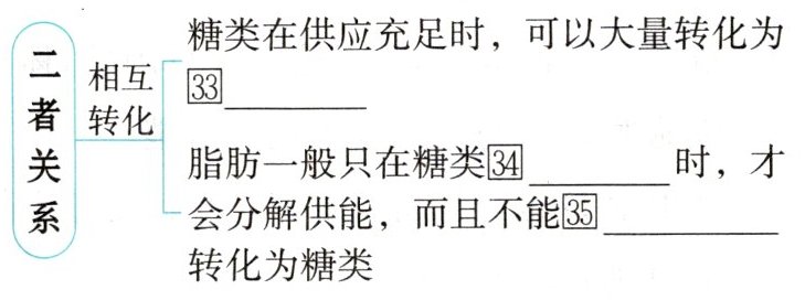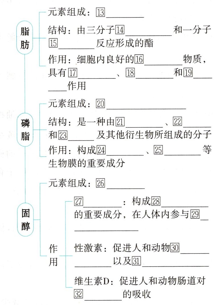 07C、H、O 08N、P 09氧 10氢 11结构 12脂溶性有机溶剂 13C、H、O 14脂肪酸 15甘油 16储能 17保温 18缓冲 19减压 20C、H、O、P甚至N 21甘油 22脂肪酸 23磷酸 24细胞膜 25细胞器膜 26C、H、O 27胆固醇 28动物细胞 膜 29血液中脂质的运输 30生殖器官的发育 31生殖细胞的形成 32钙和磷