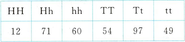 [例 9] 研究人员发现某野生稻品种甲 $ 7 $ 号染色体上具有抗病基因 $ H $,$ 12 $ 号染色体上具有耐缺氮基因 $ T $,而华南籼稻优良品种乙染色体相应位置均为隐性基因。将甲、乙杂交,$ F_1 $ 自交,用 PCR 方法检测 $ F_2 $ 群体中不同植株的基因型,发现不同基因型个体数如表。