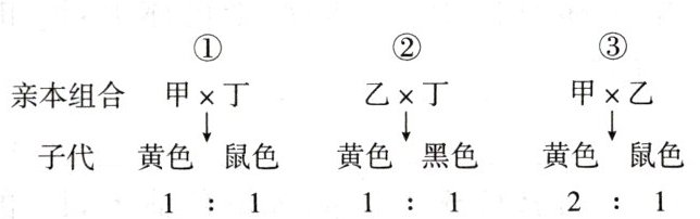 (3)小鼠短尾($ D $)和正常尾($ d $)是一对相对性状,短尾基因纯合时会导致小鼠在胚胎期死亡。小鼠毛皮颜色基因和尾形基因的遗传符合自由组合定律,若甲雌雄个体相互交配,则子代表型及比例为________________________;为测定丙产生的配子类型及比例,可选择丁个体与其杂交,选择丁的理由是________________________。