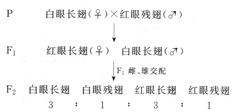 纯合亲本白眼长翅和红眼残翅果蝇进行杂交,结果如图。F₂ 中每种表型都有雌、雄个体。