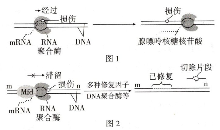 [例 2] (不定项)($2023$·辽宁,$18$,改编)$DNA$在细胞生命过程中会发生多种类型的损伤。如损伤较小,$RNA$聚合酶经过损伤位点时,腺嘌呤核糖核苷酸会不依赖于模板掺入$mRNA$(如图 1);如损伤较大,修复因子$Mfd$识别、结合滞留的$RNA$聚合酶,“招募”多种修复因子,$DNA$聚合酶等进行修复(如图 2)。下列叙述不正确的是(