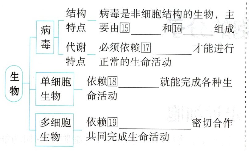 15蛋白质 16核酸 17活细胞 18单个细胞 19各种分化的细胞 20细胞 21细胞 22个体 23组织、器官、系统 24不是生命系统 25不是生命系统