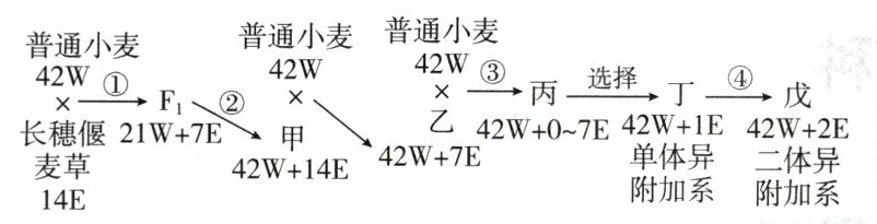[例 1] 小麦育种专家通过培育“小麦二体异附加系”,能将长穗偃麦草的抗病、高产等基因转移到小麦中,如图为普通小麦与长穗偃麦草杂交选育“小麦二体异附加系”的示意图,普通小麦($6n = 42$)记为$42W$,长穗偃麦草($2n = 14$)记为$14E$。在没有同源染色体时,减数分裂过程 E 染色体随机进入细胞一极。下列叙述错误的是(