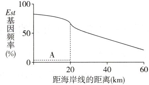 [例 1] (2024·河北,6)地中海沿岸某陆地区域为控制蚊子数量,每年在距海岸线 $0 \sim 20\ km$ 范围内(区域 A)喷洒杀虫剂。某种蚊子的 $Est$ 基因与毒素降解相关,其基因频率如图所示。下列分析正确的是(