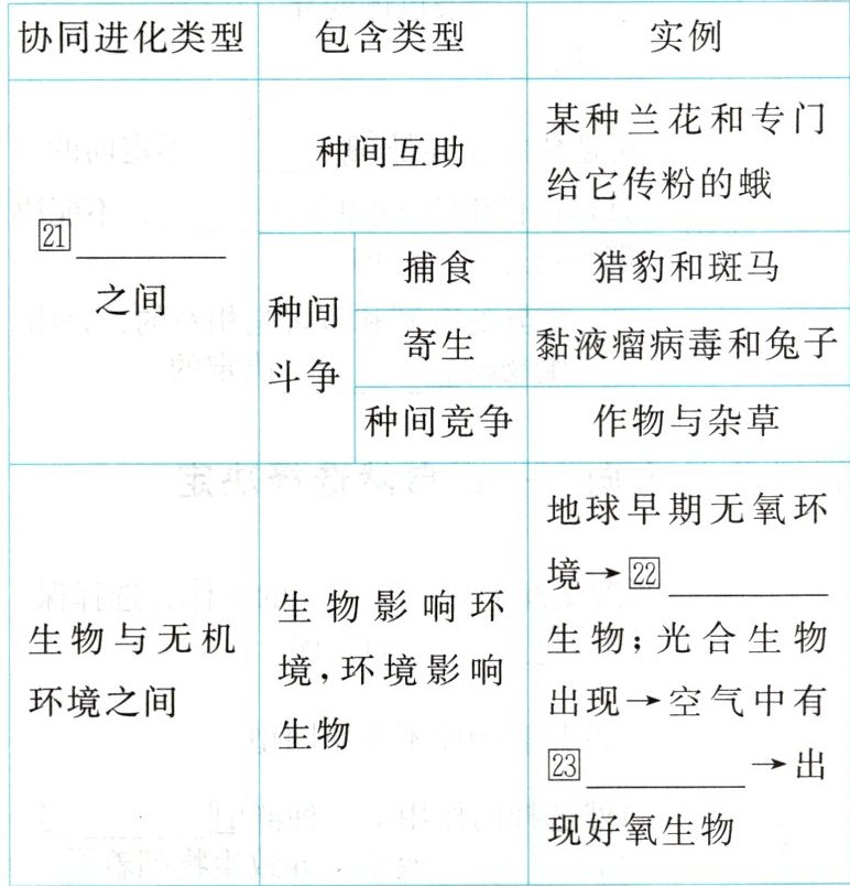 20不同物种之间、生物与无机环境之间 24遗传 25物种 26生态系统 27协同进化